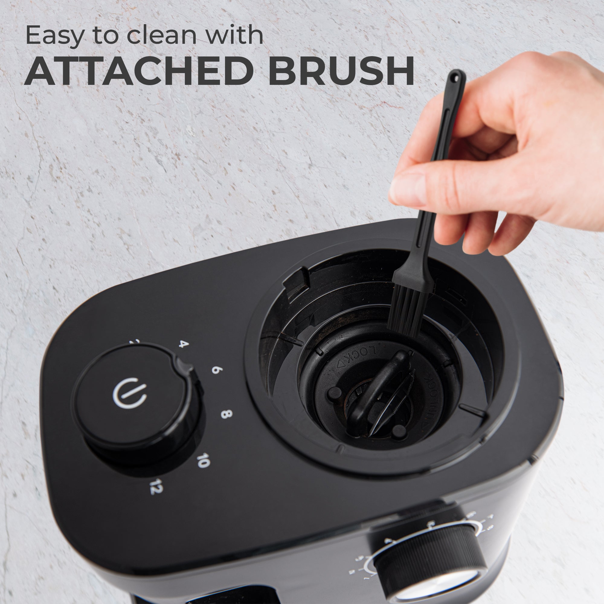 • DESIGNED FOR EASY CLEANING. Includes a cleaning brush for hassle-free maintenance. The non-slip base keeps the grinder stable during use.